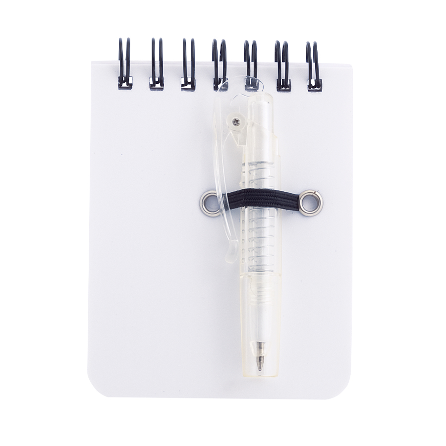 Libreta de Apuntes 60 hojas, con Bolígrafo 8 cm incluido. Tapa y contratapa plásticas. Espiral doble cero color negro.